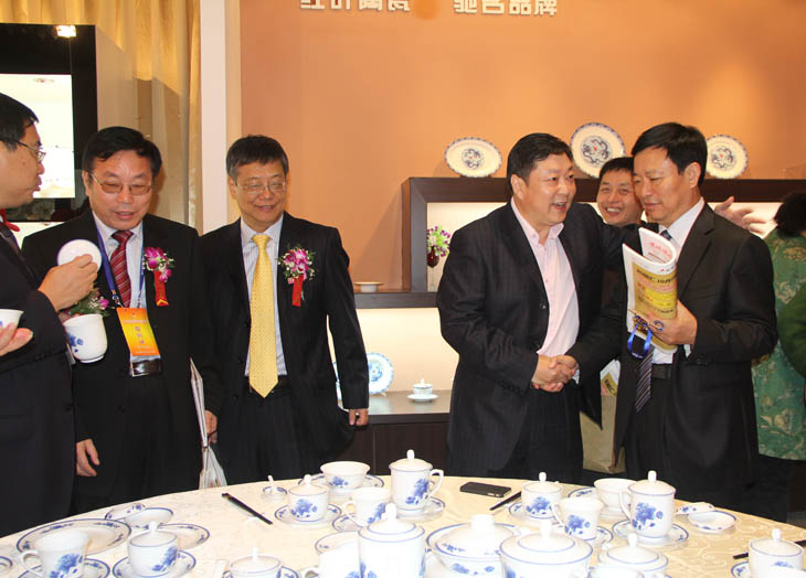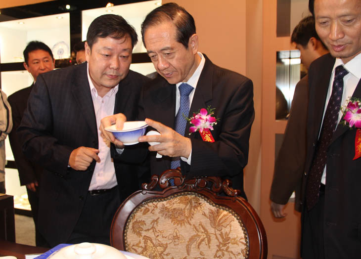全國(guó)人大常委會(huì)副委員長(zhǎng)韓啟德在我公司展館參觀,對(duì)我公司在全國(guó)青花玲瓏及青花日用陶瓷器形與裝飾設(shè)計(jì)大賽金獎(jiǎng)作品《憶漢》非常感興趣